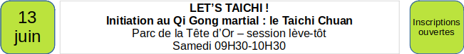 Les inscriptions pour le cours de qi gong sont closes. Vous pouvez encore intégrer le cours de taichi chuan après avoir envoyé un email à pandaagile@gmail.com, un cours d’essai gratuit est proposé par discipline pour les cours hebdomadaires.